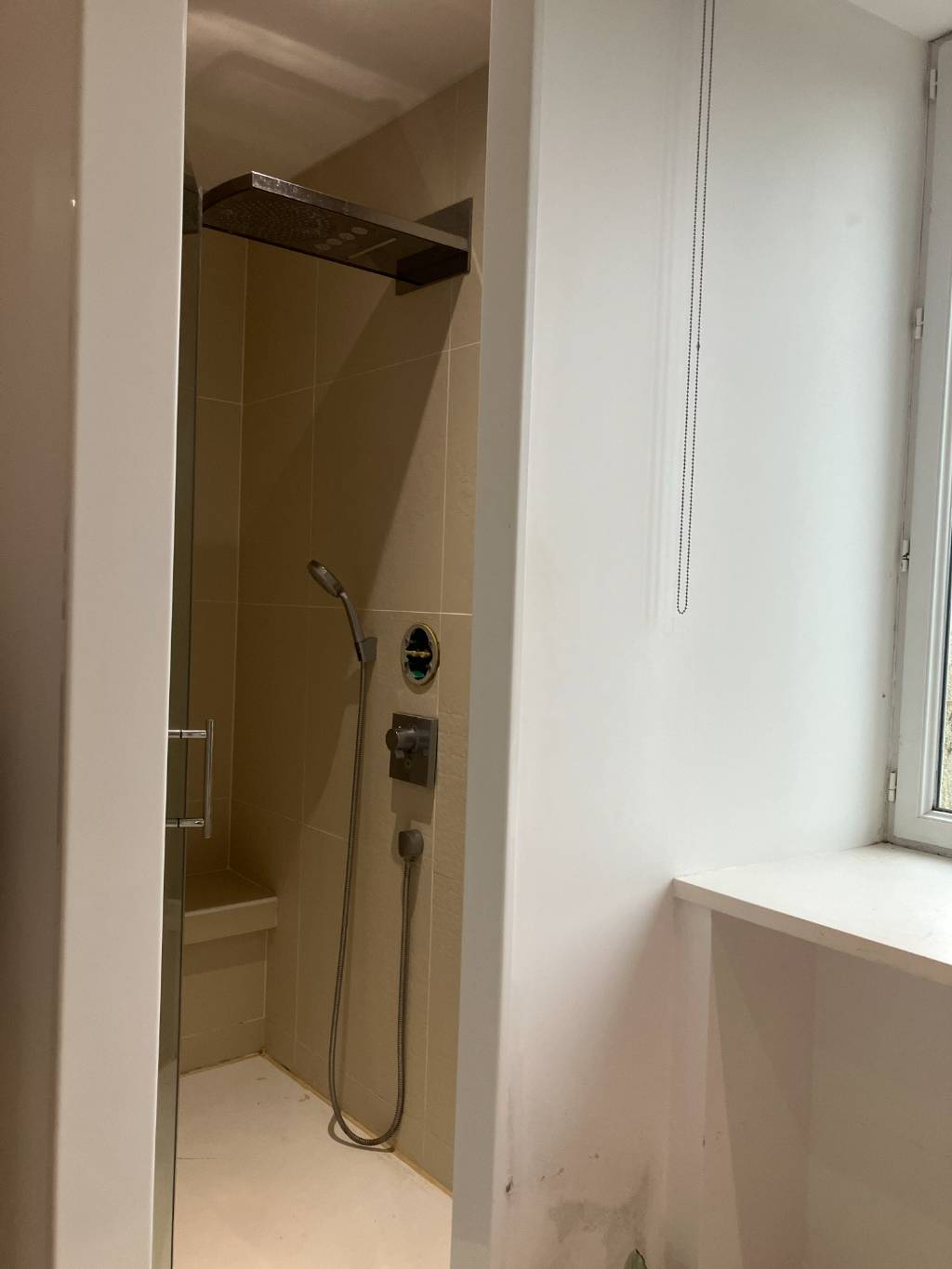 Installation d'un receveur en résine de chez Fiora, un pack encastré de chez HANSGROHE modèle Rain dance air400 avec douchette et grosse pomme encastrée au plafond ainsi qu'une porte pivotante de chez ROTH.