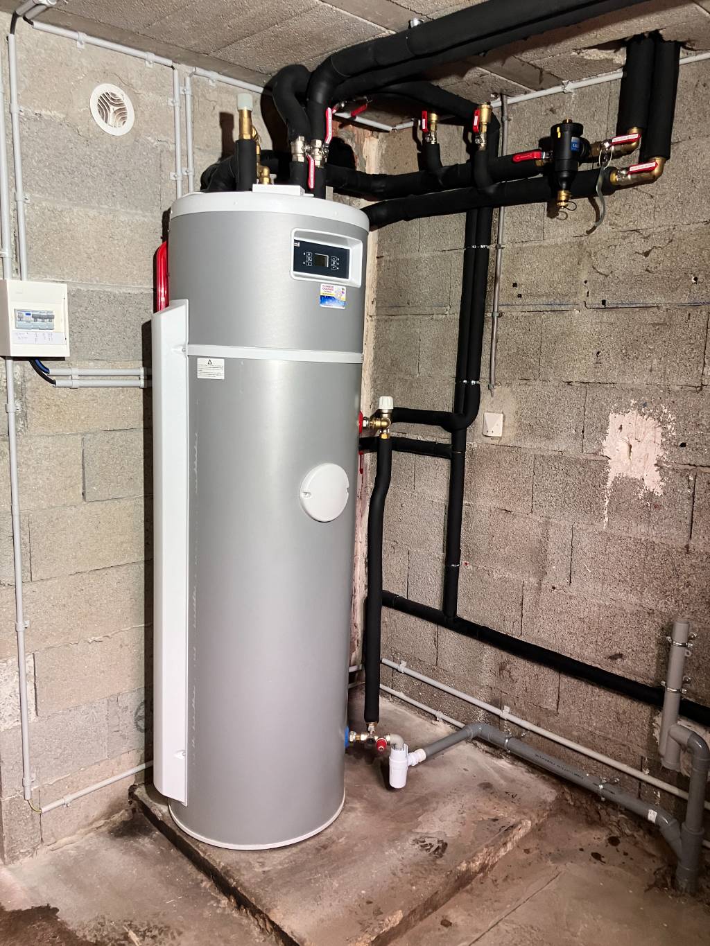 La pompe à chaleur alimente un circuit chauffage par radiateurs en fonte et gère aussi la production d'eau chaude sanitaire d'une capacité de 170 litres.