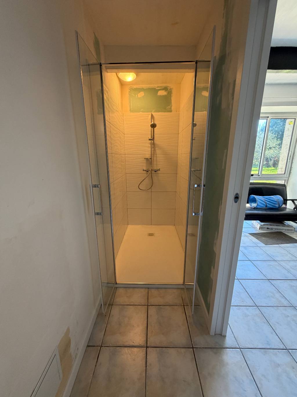 - Installation d'un receveur en résine de chez Mcbath, d'une mitigeur thermostatique avec barre et douchette de chez Hansgrohe.